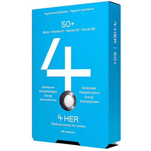 4HER 50+ er et kosttilskud skræddersyet til kvinder i overgangsalderen. Det er udviklet til at bidrage til at mindske træthed og udmattelse samt bidrage til immunsystemets normale funktion, og indeholder blandt andet vitamin B, D og K for at imødekomme kr