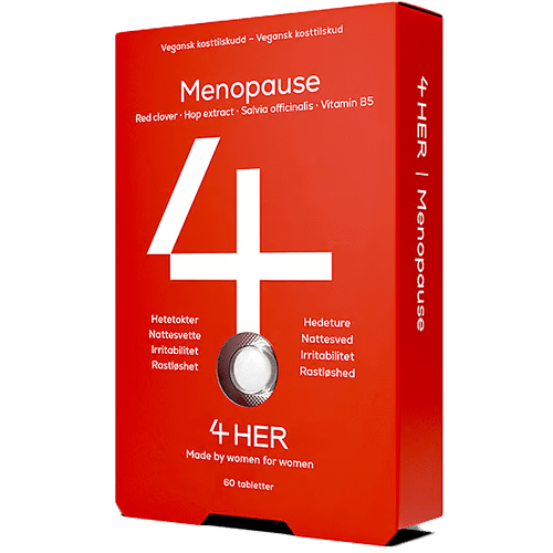 4HER Menopause er et kosttilskud til kvinder. Produktet indeholder rødkløver, B-vitaminer, selen og jod.