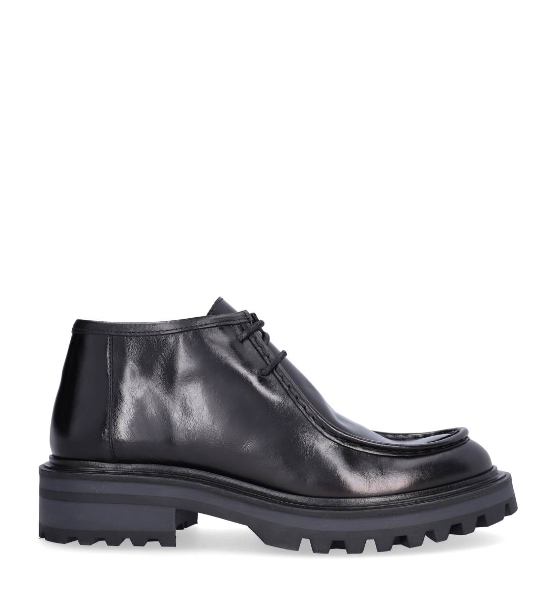 Håndlavet sko med snøre, fremstillet i sort lakeret skind og designet med en rund tå, samt snøre. Støvlen har synlige stikninger langs fronten og har en slidstærk, chunky rågummisål.