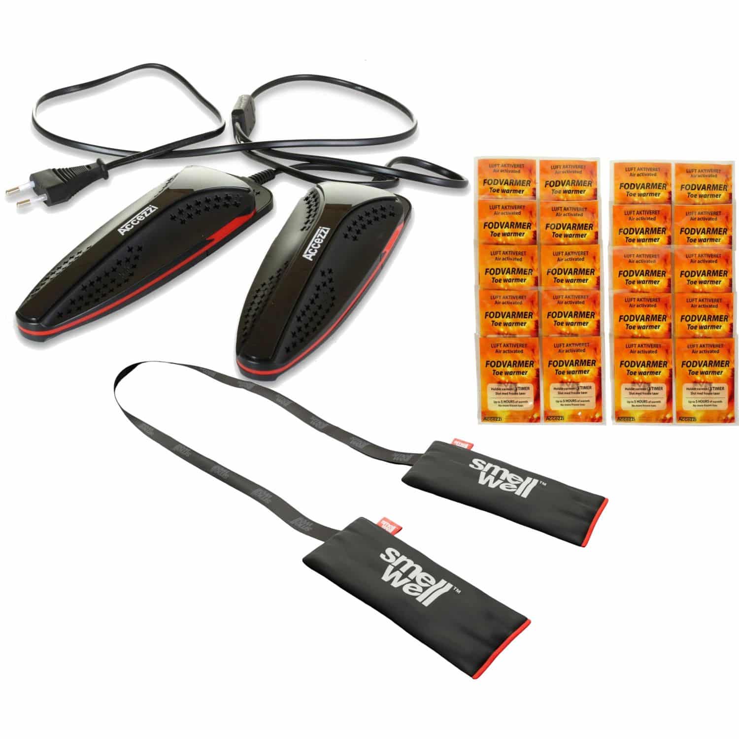 Med dette praktiske sæt fra Accezzi og Smellwell får du alt, hvad du behøver for at holde dine fødder tørre, varme og friske i vinterkulden. Sættet består af 10 par fodvarmere, en elektrisk sko- og støvlevarmer samt en Smellwell lugtfjerner.