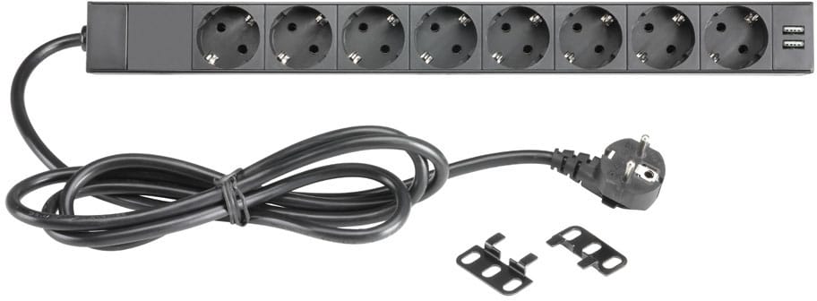 Praktisk AH 87471USB 19″ 1U rackmonteret strømskinne med 8 Schuko-udtag og dobbelt USB A-port til opladning af udstyr.