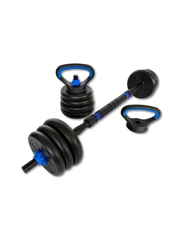 – Alt-i-én justerbart 20 kg træningssæt- Kan bruges som håndvægte, vægtstang eller kettlebell- 19 kg vægtskiver i flere størrelser- To 43 cm vægtstænger + 40 cm forbindelsesstang- Push-up og kettlebell-stænger medfølgerFå fuld kontrol over din styrketræni