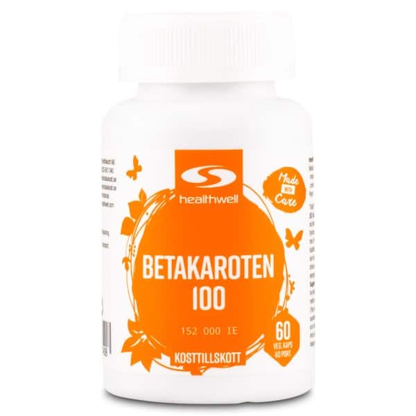 Healthwell Betakaroten 100 er en ekstra høj dosis betakaroten fra en naturlig kilde med vegetabilske kapsler. En kapsel giver dig hele 100 mg betakaroten, hvilket svarer til 152 000 IE provitamin A. Betakaroten lagres under huden og omdannes til A-vitamin, når huden har brug for det. Healthwell Betakaroten 100 indeholder desuden MCT fra kokosolie og sort peberekstrakt for optimal optagelse.