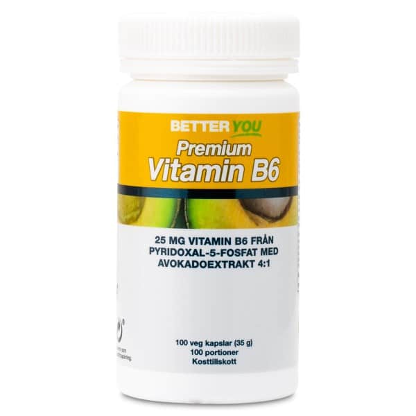 Better You Premium Vitamin B6 er et premiumtilskud med aktiv form af B6-vitamin sammen med et ekstrakt af avokado. Avokadoekstraktet hjælper optagelsen, idet det øger genkendelsesfaktoren for kroppen, som lettere kan optage næringsstoffet. Better You Premium Vitamin B6 er et svenskproduceret og vegetabilsk kosttilskud, og den anbefalede dosering er 1 kapsel om dagen.