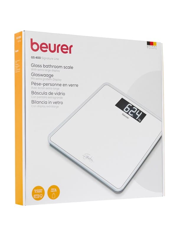 Beurer GS 400 BadeværelsesglasBeurer-badeværelsesvægten af glas med et moderne design skiller sig ud med sin store ståflade lavet af sort sikkerhedsglas. Nyd vejning ved hjælp af vægten med det karakteristiske SignatureLine-designFunktioner:Moderne, belys