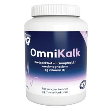 Biosym OmniKalk (120 stk) Biosym OmniKalk er den ideelle måde at støtte dit kalciumbehov på. Dette kosttilskud indeholder kalcium, som er en vigtig mineral, der spiller en afgørende rolle i opbygningen af sunde og stærke knogler og tænder. Kalcium er også vigtigt for at understøtte muskelfunktionen og nervesystemet. Med Biosym OmniKalk kan du være sikker på, at du får en passende mængde af dette vigtige mineral, der hjælper med at opretholde din generelle sundhed og trivsel. Biosym OmniKalk er velegnet til folk i alle aldre og kan hjælpe dig med at opretholde en sund og aktiv livsstil. Næringsindhold Dosis og Anvendelse Anbefalet dagsdosis voksne og børn fra 11 år: 2 tabletter. Dagsdosis bør ikke overskrides. Indeholder 2 tabletter indeholder: Calcium (carbonat/citrat) 400 mg 50 % Magenesium (oxid/carbonat/citrat) 200 mg 53 % Vitamin D3 (cholecalciferol) 20 mikg 400 % Ingredienser: Calciumcarbonat, tricalciumcitrat, magnesiumcitrat, magnesiumcarbo-nat, magnesiumoxid, maltodextrin (majs), cholecalciferol udvundet af lanolin. Konsistens-midler: Mikrokrystallinsk cellulose, croscarmellosenatrium, siliciumdioxid, stearinsyre, vegetabilske magnesiumsalte af fedtsyrer. Overfladebehandlingsmidler: Hydroxypropylmethylcellulose, hydroxypropylcellulose, risstivelse. 2 tabletter indeholder: RI* Calcium (carbonat/citrat) 400 mg 50 % Magenesium (oxid/carbonat/citrat) 200 mg 53 % Vitamin D3 (cholecalciferol) 20 mikg 400 % *Referenceindtag for voksne Opbevaring Opbevares tørt og ikke for varmt. Opbevares utilgængeligt for børn. Vær opmærksom på Kosttilskud bør ikke træde i stedet for varieret kost.