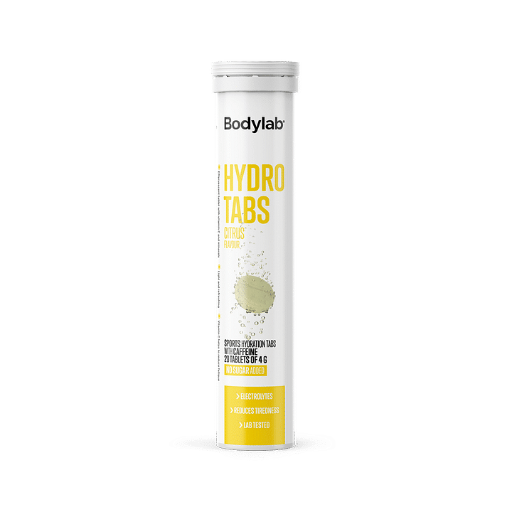 Med Bodylab Hydro Tabs kan du nemt og bekvemt blande din egen sportsdrik. Hver tablet indeholder, foruden 50 mg ren koffein, også en kombination af vitaminer og mineraler (elektrolytter) som sikrer at din sportsdrik