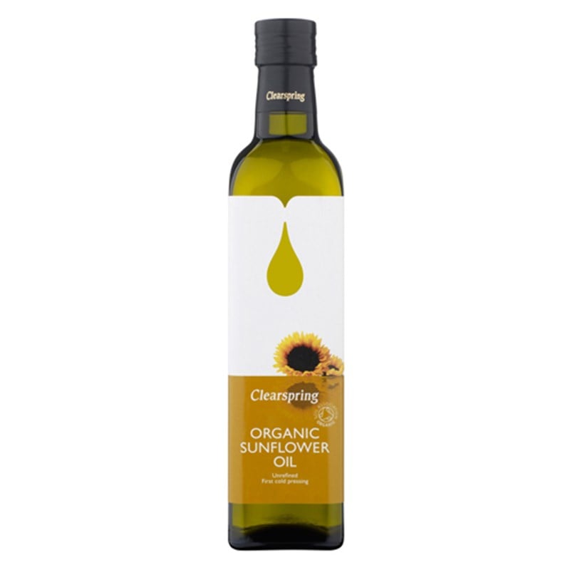Clearspring økologisk solsikkeolie, har en gylden gul farve og en udsøgt nøddesmag. Den er meget anvendelig. Den er en god kilde til E Vitamin og ideel i salater, dressinger og bagværk.
