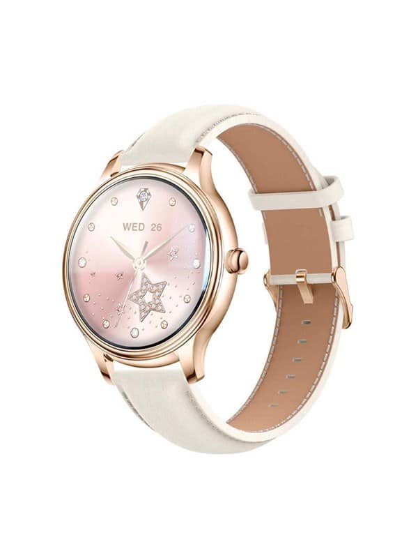 COLMI L28 smartwatch i guld med læderrem kombinerer luksusdesign med avanceret teknologi i en slank 7,9 mm kasse, perfekt til kvinder. 1,32-tommer AMOLED-skærm med Always-on Display og over 100 tilpasselige urskiver giver skarpe farver og intuitiv betjeni
