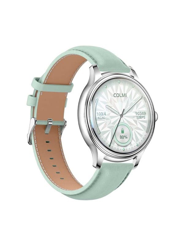COLMI L28 smartwatch i sølv-grøn med læderrem kombinerer luksuriøst design og avancerede funktioner i en slank 7,9 mm kasse, perfekt til kvinder. 1,32-tommer AMOLED-skærm med Always-on Display og over 100 tilpasselige urskiver giver skarpe farver og intui