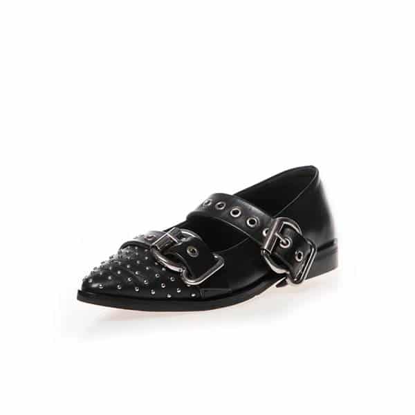Must have ballerina fra Copenhagen Shoes Feminine ballerinaer i læder, dekoreret med sølvfarvede nitter og en let spidset snude. Designet inkluderer et dobbelt spænde over foden og er 100% størrelsessvarende. Disse sko er skabt til at imødekomme den moder