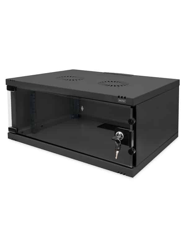 Kabinet, 540 x 400 mm (WxD), ikke-samlet, vægmonterbar, sort, RAL 9005, 4U, 19″