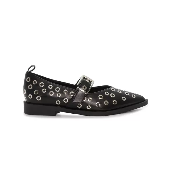 Duffy FULGATORE CINQUE 97-21269-01 er et par trendy sko med et markant design, der kombinerer komfort og stil. Den sorte overflade er dekoreret med sølvfarvede metaløjer, som giver skoen et råt og moderne look. Den justerbare rem med spænde sikrer en god pasform, mens den spidse snude tilfører elegance til det ellers edgy udtryk. Perfekte til dig, der ønsker en behagelig sko med masser af attitude – ideel både til hverdagsbrug og til at sætte et personligt præg på dit outfit.