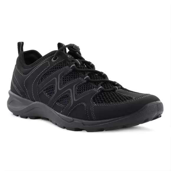 Lækker fritidssko fra Ecco i serien Terracruise, skoen er lavet i sort tekstil og syntetiske materialer. Den gode sporty sko har en dejlig komfort og er indvendigt tekstilforet og har en udtalelig indlægssål. Elastiksnørebåndet gør at det er super nemt at tage den på foden og nettet på forfoden, samt siderne giver en god luftcirkulation. Ydersålen er lavet i PU.
