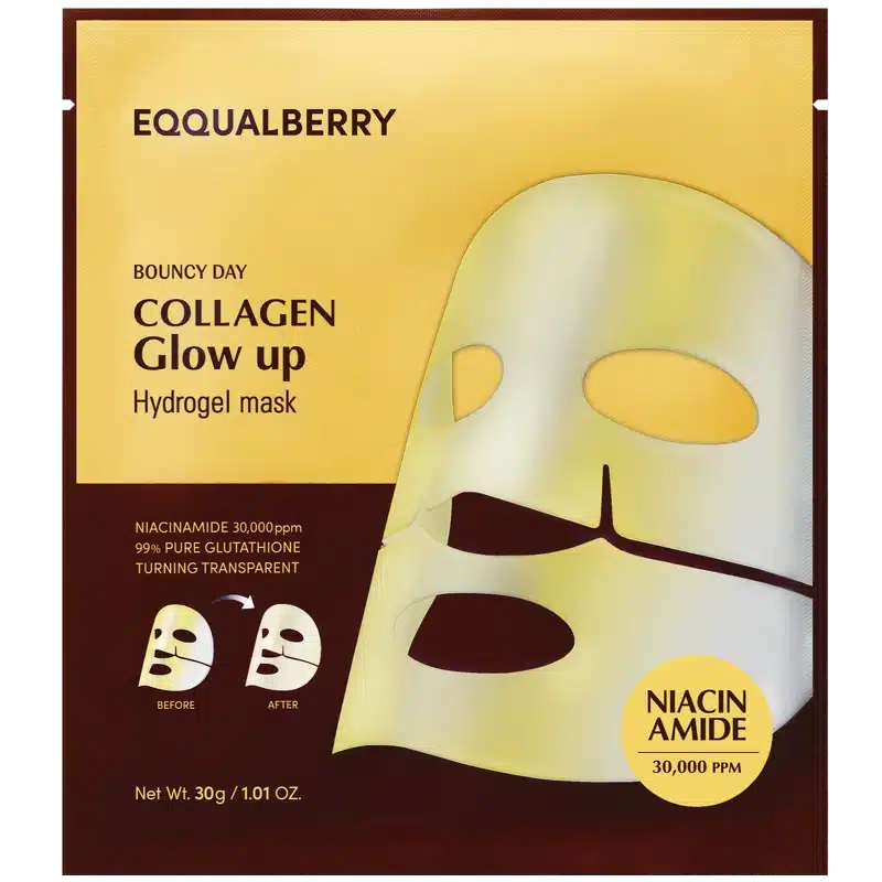 Eqqualberry Collagen Glow Up Hydrogel Mask er en avanceret hydrogelmaske, der er udviklet til at give en stor mængde fugt og en strålende glød. Sheet-masken indeholder lavmolekylær kollagen og niacinamid i en koncentration på 30.000 ppm, som arbejder samm