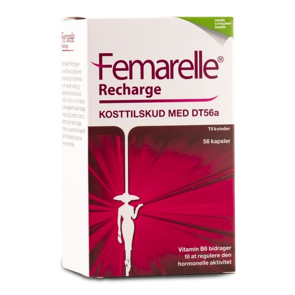 Femarelle Recharge er et kosttilskud med det patenterede sojaekstrakt DT56a, hørfrøekstrakt og vitamin B6. Vitamin B6 har flere vigtige funktioner i kroppen. B6 bidrager blandt andet til at mindske træthed og udmattelse, regulering af hormonaktiviteten samt til normal psykologisk funktion.