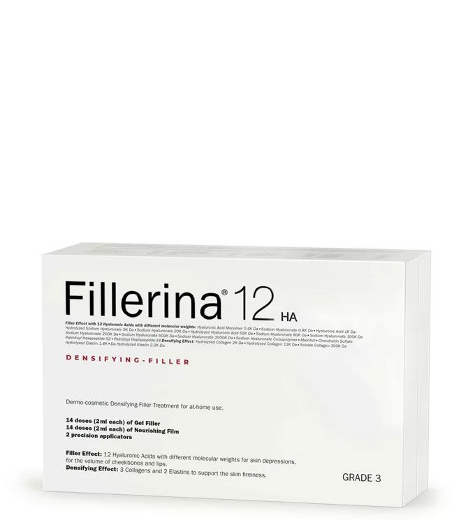 Fillerina 12HA Filler Grade 3 er en del af Fillerinas stærkeste kur, da den indeholder 12 former for hyaluronsyrer, samt 3 kollagen og 2 elastinmolekyler. Kuren er opbygget som en 2-trinskur til hjemmebrug helt uden behov for nåle. Kuren anvendes ikke i