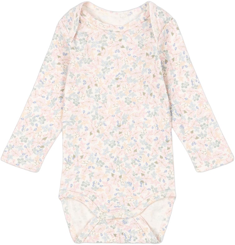 Blød bodysuit i økologisk bomuld med lange ærmer. Fremstillet i en fleksibel ribbe med en praktisk kuverthalsfunktion, der gør den nem at tage af og på, samt nemme trykknapper mellem benene til bleskift