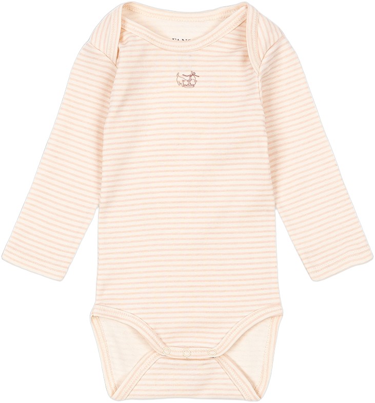 Blød bodysuit i økologisk bomuld med lange ærmer. Fremstillet i en fleksibel ribbe med en praktisk kuverthalsfunktion, der gør det nemt at tage den af og på, samt nemme trykknapper mellem benene til bleskift