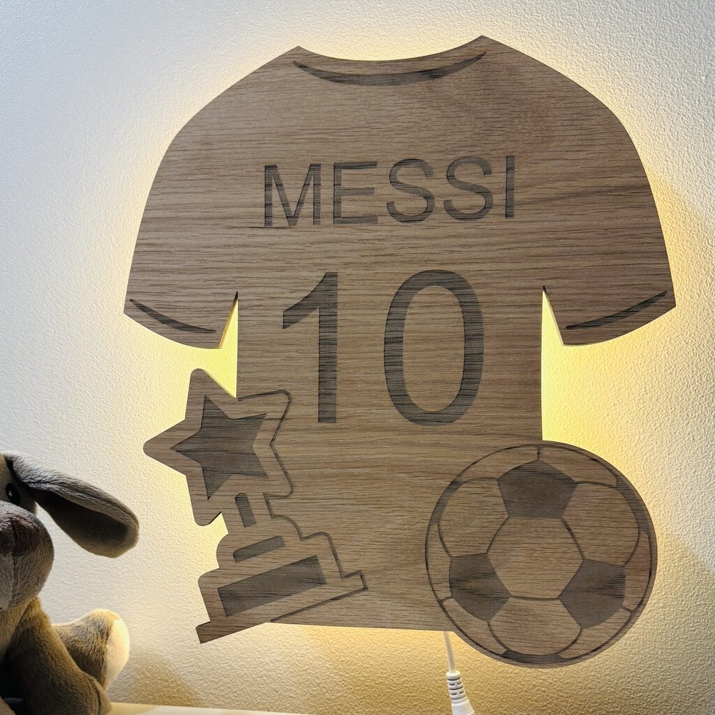 Vores fodboldtrøje lampe i egetræ spreder et blødt, varmt lys – perfekt til puttetid og rolige stunder.Â