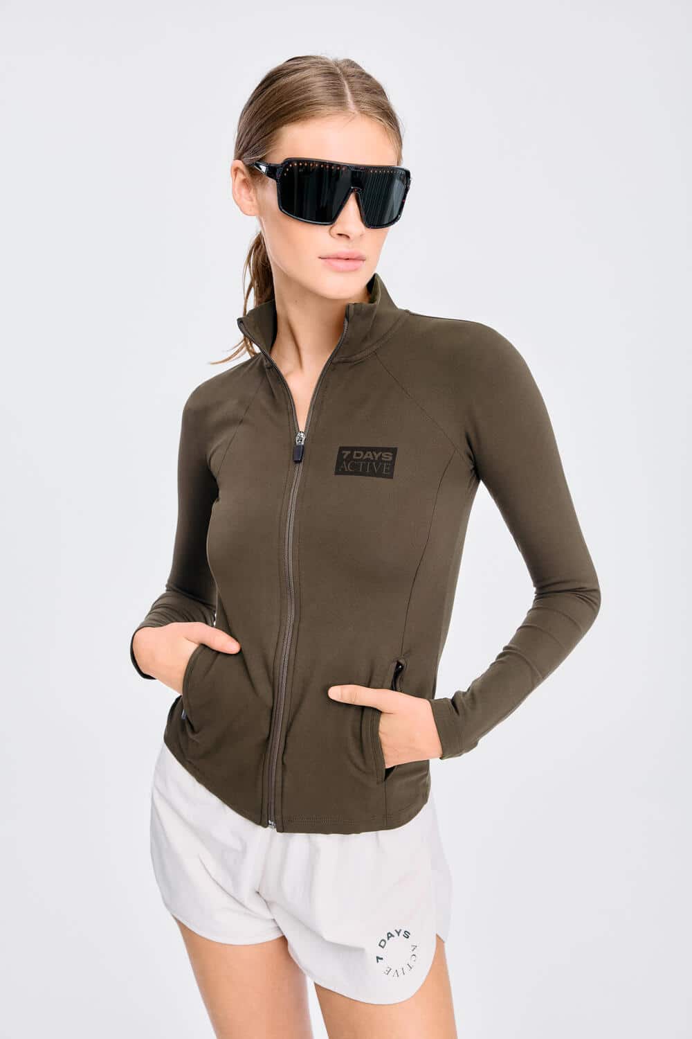 Mørkebrun træningsbluse fra 7 DAYS ACTIVE med en tætsiddende pasform og høj hals. Trøjen er designet med lynlås, lommer i siderne og et sort logo på det ene bryst.