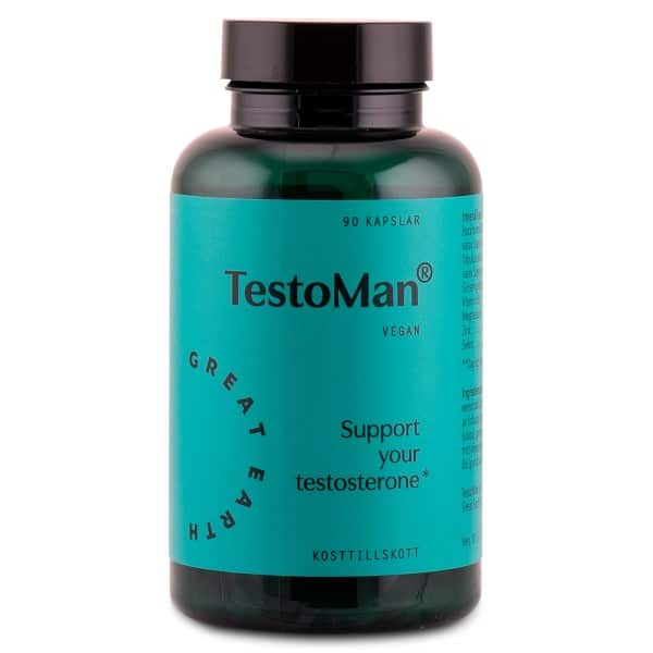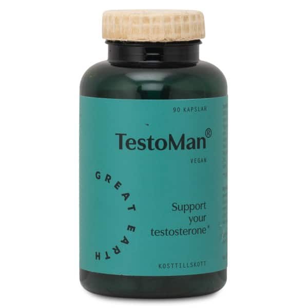 TestoMan fra Great Earth er særligt udviklet til mænd over 35 år, der oplever ændringer i kroppen som nedsat testosteron, træthed, humørsvingninger og reduceret sexlyst. Mænd, ligesom kvinder, gennemgår en overgangsfase, der ofte begynder ved 35-40 års alderen og medfører en række kropslige ændringer. TestoMan er formuleret til at støtte energiniveauet og reducere træthed og udmattelse. Med bukkehorn og Tribulus terrestris samt vigtige mineraler og vitaminer som zink, magnesium og vitamin B6. Zink bidrager til at opretholde normale testosteronniveauer og understøtter immunforsvarets funktion. Magnesium bidrager til musklernes normale funktion, og vitamin B6 understøtter energiomsætningen samt reducerer træthed og udmattelse.