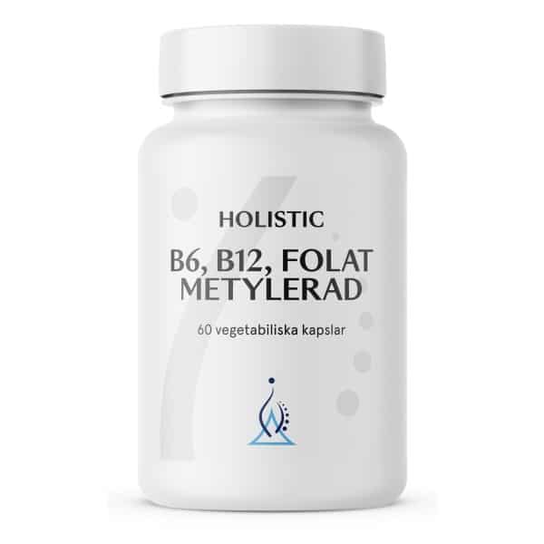 Holistics kosttilskud B6, B12, Folat Methyleret indeholder fire udvalgte B-vitaminformer samt methylgruppe-donoren trimethylglycin. Methylering er en kemisk proces, der er forbundet med blandt andet DNA-funktioner på celleniveau, en proces som kroppen udfører for at reparere og afgifte kroppen. B6, B12 og folat bidrager sammen til at immunforsvaret opretholder sin normale funktion, reducerer træthed og udmattelse, normal psykologisk funktion og normal homocysteinomsætning. Kapslen er vegetabilsk og lavet af pullulan.