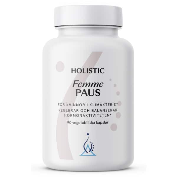 Holistic Femme Paus er et kosttilskud specielt udviklet til kvinder i overgangsalderen og indeholder blandt andet vitamin B6, magnesium og zink. Vitamin B6 hjælper med at regulere hormonaktiviteten, magnesium hjælper med at mindske træthed og udmattelse og zink bidrager til at opretholde en normal benstyrke, hår, hud og negle samt bidrager til hormonel balance. Sammen med rødkløverekstrakt og humleekstrakt understøtter de en rolig overgangsalder.