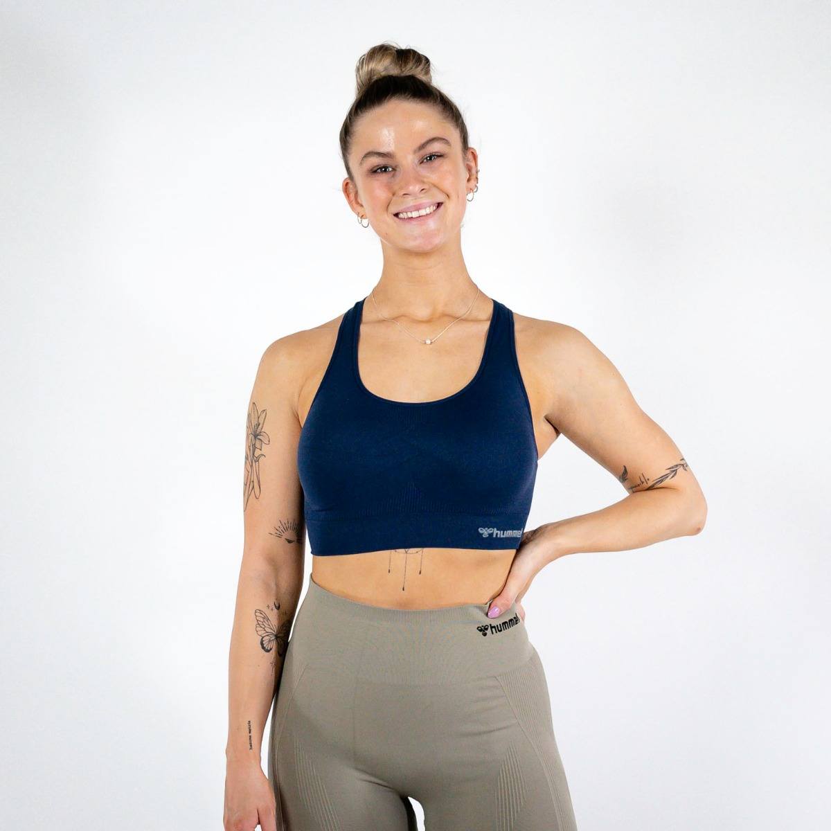 Hummel TIF Seamless Sports Top – Black Iris TIF Seamless Sports Top – Black Iris er en sports-bh til kvinder fra danske Hummel®. Sports-bh’en er designet i et strækbart og svedtransporterende materiale med en seamless-konstruktion, som gør Hummel TIF Seamless Sports Top ideel til alt slags træning. Med seamless-konstruktionen får du en sports-bh med øget fleksibilitet og komfort. Hummel TIF er desuden lavet i dele af genanvendt polyamid, der medvirker til mindre miljøaftryk. Stoffet er derudover designet med en BEECOOL-teknologi og antibakteriel behandling, som sikrer en god pasform og modvirker svedlugt. Strækbart og seamless-materiale Designet i genanvendt polyamid Antibakterielt behandlet Komfortabel pasform Bryderyg Hummel TIF Seamless Sports Top fås både i farverne Black Iris, Black, Vetiver, White, Basil, Fudge og Sugar Coral Modellen er 175 cm høj og bruger størrelse M. Specifikationer Farve: Navy-blå (Black Iris) Pasform: Tætsiddende Vaskeanvisning: Vask ved max 40°C skånevask. Tåler ikke tørretumbling og strygning Materialer: 65% genanvendt polyamid, 27% polyamid, 8% elastan
