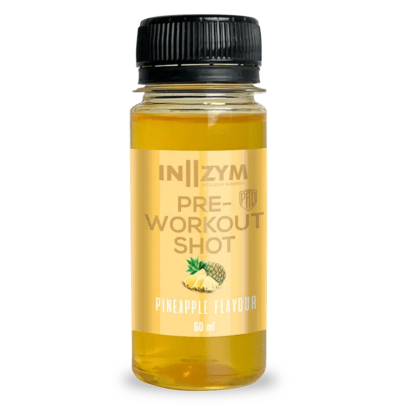 IN2ZYM PWO Shot – Pineapple (60 ml) Energirige pre workout shots fra IN2ZYM. Højt koffeinindhold Lækre smagsvarianter Hvert shot indeholder hele 200 mg koffein og aminosyrerne; beta-alanin, l-arginin, l-citrullin og l-carnitin. Anbefalet daglig dosis 30 ml (½ flaske). Anbefalet daglig dosis må ikke overskrides. Kosttilskud må ikke træde i stedet for en varieret og sund kost. Bør opbevares uden for små børns rækkevidde. Næringsindhold NÆRINGSINDHOLD 1 PORTION (30 ML) % RI* Beta-alanin 1.000 mg L-Arginin 1.000 mg L-Citrullin 500 mg L-Carnitin 250 mg Koffein 100 mg Vitamin B6 0,7 mg 50 % Vitamin B12 (cyanokobolamin) 1,25 µg 50 % *Dagligt referenceindtag (RI) af vitaminer og mineraler for voksne. Kosttilskud med aminosyrer, koffein og vitaminer, med smag af ananas. Indeholder sødestoffer, indeholder højt koffeinindhold (100 mg pr. anbefalet daglig dosis). Bør ikke indtages af børn og gravide. Ingredienser: Vand, beta-alanin, L-arginin, L-citrullin, L-carnitin, koffein, konserveringsmiddel (E211, E202), aroma, farvestof (E160a), sødestof (sukralose), vitamin B6 (pyridoxinhydrochlorid), vitamin B12 (cyanokobolamin).