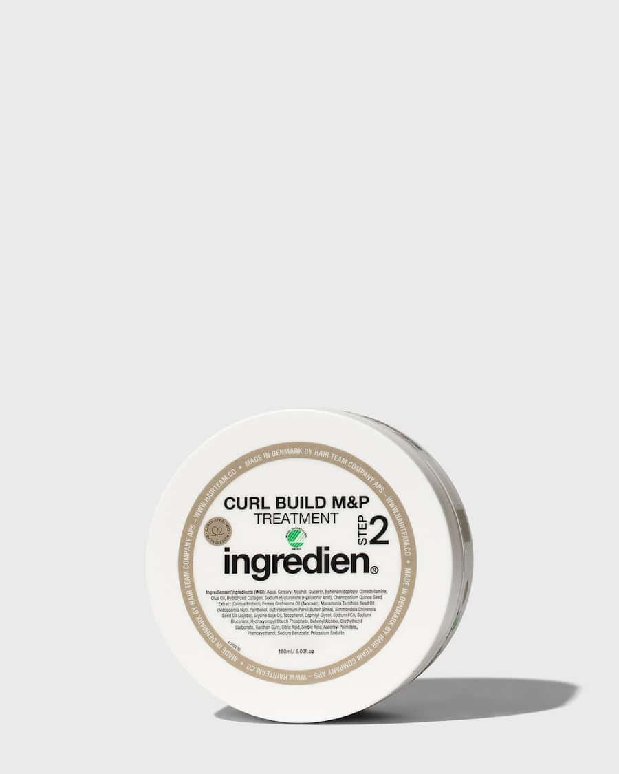 ingredien Curl Build Moisture & Protein Treatment er en dybdevirkende og genopbyggende treatment. Den har en unik sammensætning af proteiner, fugt og kollagen. Fugten kommer blandt andet fra seabutter, og giver elasticiteten tilbage i håret. Proteinen qui