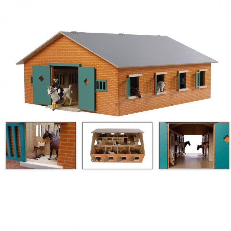 I denne fine hestestald i træ fra Kids Globe er der 7 bokse og foderrum. Taget kan åbnes så man kan kigge ind og lege 🙂