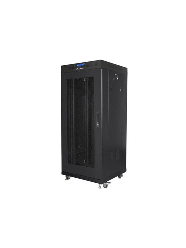 Rack kabinet, flad pakke, med netdør, 600×800, fritstående, sort, RAL 9004, 27U, 19″