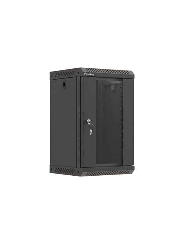 Rack kabinet, 300 x 300, med glasdør, flad pakke, vægmonterbar, sort, RAL 9004, 9U, 10″