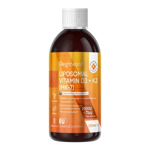 WeightWorlds Liposomal D3-Vitamin + K2 er højt koncentrerede D-vitamin væske beriget med K2-vitamin til dine knogler, led, muskler og immunforsvar. Væsken er det perfekte alternativ til almindelige vitaminpiller, hvis du har svært ved at sluge kapsler. Ta