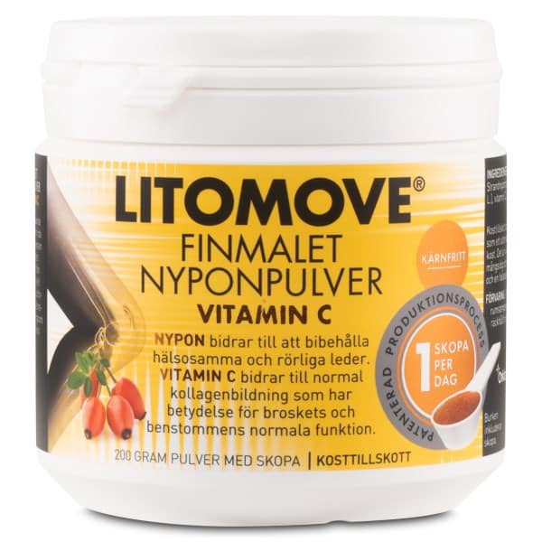 LitoMove Hybenpulver er 100 % kernefrit hybenpulver fra omhyggeligt udvalgte strandhyben, med tilsat vitamin C. Aktive stoffer i hybenet hjælper med at bevare smidige led. Vitamin C bidrager til dannelsen af kollagen, hvilket er vigtigt for knoglernes normale funktion. Derudover virker det som antioxidant og modvirker cellenedbrydning.