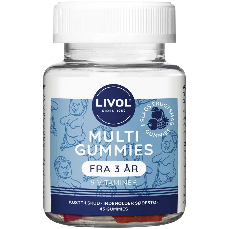 Livol Multi Gummies Original er et kosttilskud til børn og voksne, i form af vingummier, med en skøn smag af frugt, så man kan glæde sig til at tage sine vitaminer hver dag. Indholdet består af vitamin -A, -C, -D, -E, -B6 og B12 samt niacin, folsyre og bi