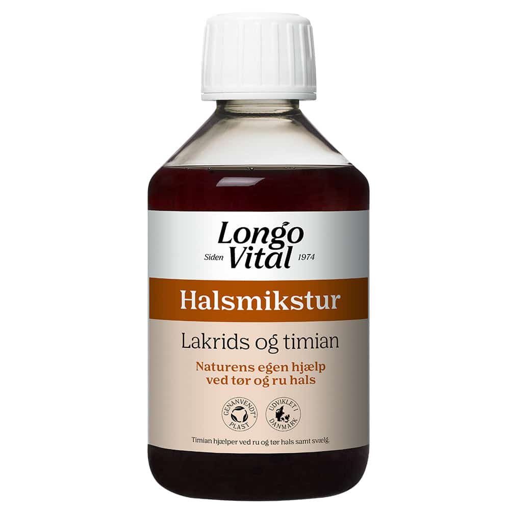 Longo Vital Halsmikstur (250 ml) Halsmikstur fra Longo Vital er en naturlig sammensætning af timian- og lakridsekstrakt til dig der døjer med tør og ru hals. Indeholder timian- og lakridsekstrakt Bekæmper tør og ru hals Den anbefalede daglige dosis bør ikke overskrides. Kosttilskud bør ikke træde i stedet for varieret kost. Opbevares uden for børns rækkevidde. Næringsindhold 15 ml. indeholder: Daglig dosis Mængde Enhed RI Lakridsekstrakt 692 mg – – glyzyrrhizin 45 mg – – fra ca. mængde lakridsrod 2,8 mg – Timianekstrakt 250 mg – – fra ca. mængde timianblade 1 g – RI = Dagligt referenceindtag for voksne og børn over 11 år. – RI ikke fastlagt. Ingredienser: Renset vand, Sukrose, Lakridsekstrakt (Glycyrrhiza glabra L.), Timianekstrakt (Thymus vulgaris L.), Aroma, Brændt sukkersirup, Konserveringsmiddel (kalliumsorbat), Fortykningsmiddel (xanthangummi), Surhedregulerende middel (saltsyre)
