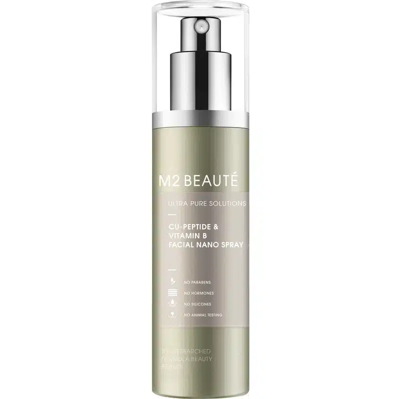 M2 Beauté Ultra Pure Solutions Cu-Peptide & Vitamin B Facial Nano Spray er et multifunktionelt produkt, som kan lidt af hvert. Denne spray forstøves med mikrofine partikler på huden, og lægger sig helt vægtløst på overfladen. De aktive stoffer i produktet