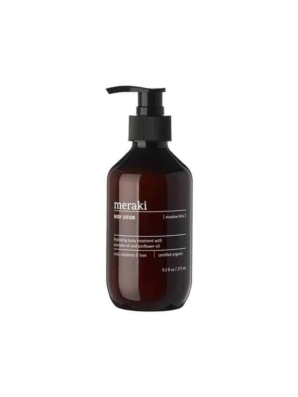 Meraki – Bodylotion – Meadow bliss 275 ml.Økologisk aloe vera forhindrer din hud i at tørre ud, mens økologisk avocadoolie blødgør og fugter. Olien er rig på antioxidanten E-vitamin. Bodylotionen duftnoter af bitter citrus, træ, verbena og te.Velegnet til