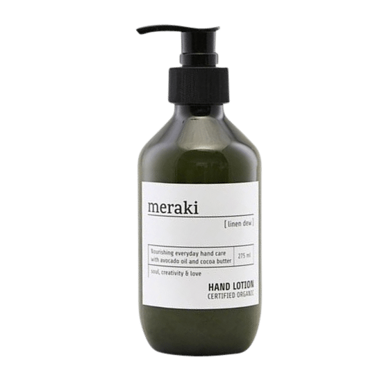Meraki Linen Dew håndlotion plejer, fugter og blødgør dine hænder uden at fedte. Den indeholder økologiske ingredienser som aloe vera, kakaosmør og avocadoolie, der bidrager med E-vitamin. Velegnet til daglig brug og alle hudtyper.