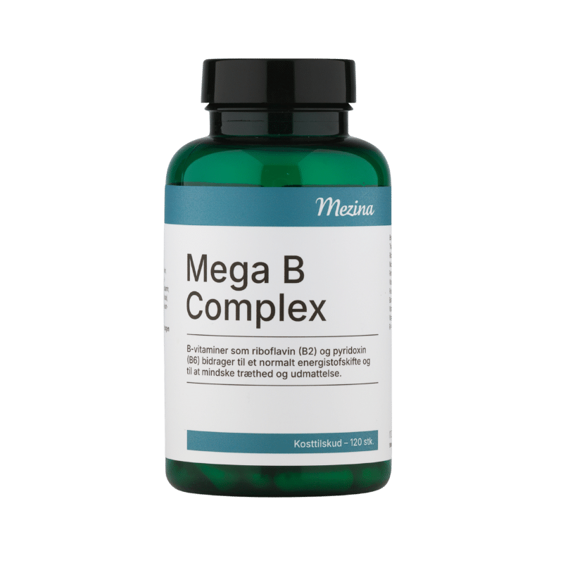 Mezina Mega B Complex støtter energi, mindsker træthed og beskytter cellerne med alle vigtige B-vitaminer og C-vitamin. Dansk kvalitet og erfaring.