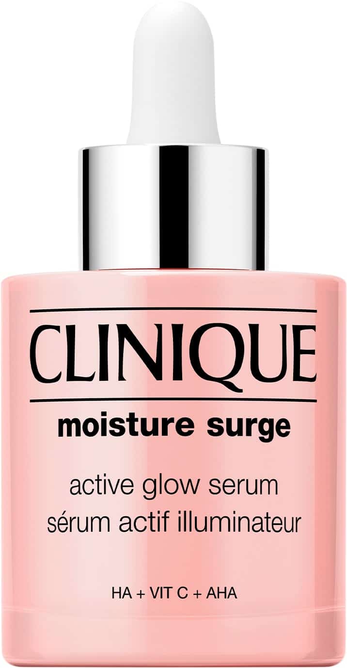 Moisture Surge Active Glow Serum fra Clinique er et let eksfolierende serum med 5 % mælkesyre, hyaluronsyre og C-vitamin, som hjælper med at eksfoliere, fugte og lysne huden. Dette serum eksfolierer mildt og fjerne døde hudceller, mens den fugter huden i