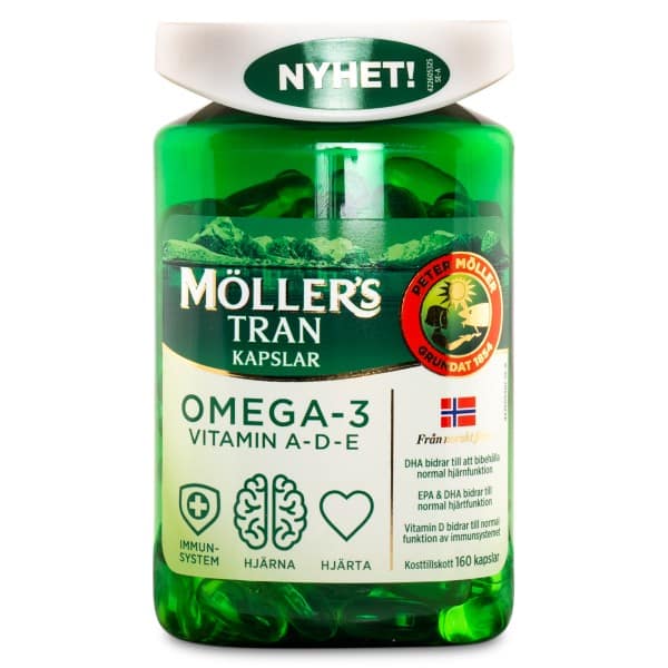 Möllers Omega-3 er kapsler med MSC-certificeret torskeleverolie fra bæredygtigt vildfanget norsk torsk. Torskeleverolie er en naturlig kilde til de vigtige omega-3 fedtsyrer DHA og EPA samt flere vitaminer. DHA og EPA bidrager til normal hjertefunktion, og DHA understøtter også hjernens normale funktion. Vitaminerne A, D og E har forskellige vigtige funktioner i kroppen. Vitaminerne A og D bidrager til immunsystemets funktion, mens vitamin E hjælper med at beskytte cellerne mod oxidativt stress.