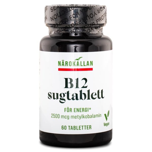 Närokällan B12 Sugetablett er fleksible sugetabletter med vitamin B12 i form af methylcobalamin. Sugetabletterne er veganske og har en god frugtsmag. Vitamin B12 bidrager til en normal psykologisk og neurologisk funktion, til normal energiomsætning og til dannelsen af blodlegemer.