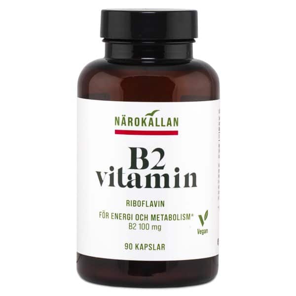 Riboflavin, vitamin B2, er et vitamin med flere vigtige funktioner i kroppen. Det bidrager blandt andet til normal stofskifte og nedbrydning af fedt, kulhydrater og protein. Det bidrager også til normalt fungerende nerver samt til normal hud. Riboflavin fra Närokällan indeholder 100 mg riboflavin per kapsel.