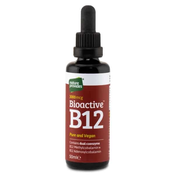 Nature Provides Bioactive B12 er en kraftfuld og biotilgængelig blanding, der indeholder de mest aktive former for B12-vitamin, coenzym methylcobalamin og adenosylcobalamin. Tilskuddet indeholder ingen konserveringsmidler eller farvestoffer og er kun blandet med renset vand.