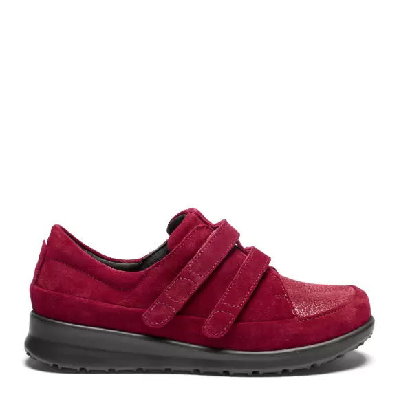Smarte røde sko til kvinder fra new feet med to velcrolukninger, der er med til at gøre skoen nem og hurtig at få af og på. Skones overdel er lavet en pæn og behagelig Nubuck med orthostretch. Skoen er lavet med god og behagelig letvægtssål, med den nye generation EVA.Hælløft 25 mm – Drop 15 mmLæst: 62Læstgruppe: WIndersål: Protektor 6 mm (udtagelig)