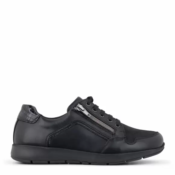 Flot og rigtig behagelig sko til damer fra New Feet, som er lavet med en god og rigtig behagelig overdel i Nubuck, der ikke alene giver skoen flot udtryk, men og så gør dem behagelig at have på. På skoens yderside er der påsat en praktisk lynlås der gør skoen hurtig og nem at få af og på. Skoen er også udstyret med traditionelle snørebånd, som gør den nemt kan justeres og tilpasses til foden.