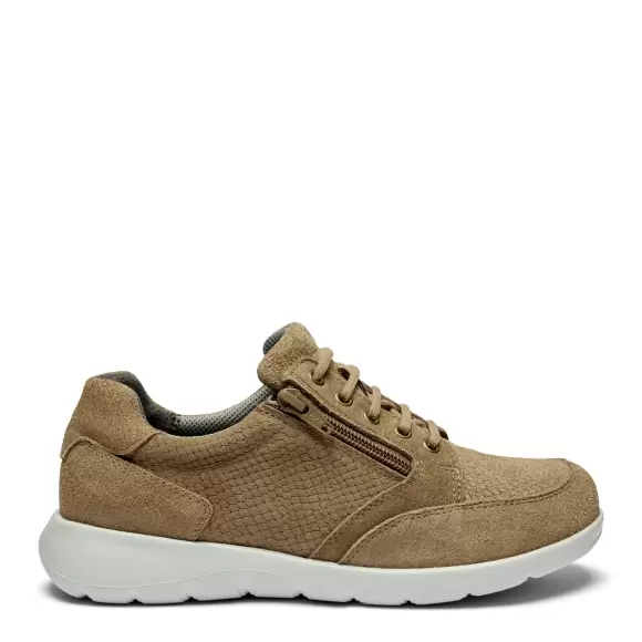 Stilfuld og praktisk damesneaker i sandfarvet læder med struktur og print. Modellen kombinerer moderne design med funktionelle detaljer som snørebånd og lynlås, der gør det nemt at få skoen af og på – med perfekt pasform hver gang.